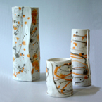 Paperporzellan, Transparentglasur, Engoben Brenntemperatur 1250°C Maße: ø 8cm, h 19cm, ø 6cm, h 16cm, ø 8cm, h 10cm Preis: 48,00 €, 46,00 € und 36,00 €